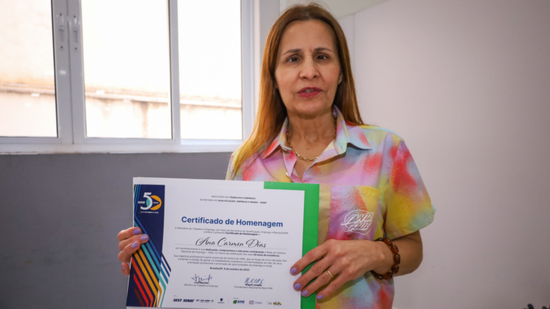 Na última quarta-feira, 8, Ana Carmen foi uma dos três representantes da Região Sul, sendo dois do Paraná, entre os 37 servidores do Brasil homenageados em Brasília por suas atuações e dedicação nas agências do trabalhador, durante as comemorações dos 50 anos do Sistema Nacional de Emprego (Sine). O evento foi promovido pelo Ministério do Trabalho e Emprego (MTE).