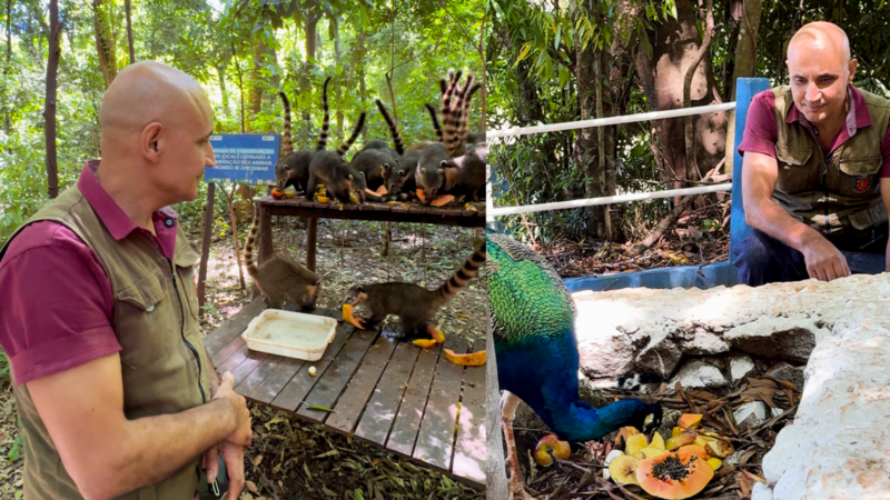 “Diariamente servimos um banquete para os animais, com uma variedade de legumes e frutas, como banana, maçã, melão e mamão”, afirma Nilson. Ele completa, sorrindo: “Os alimentos são de alta qualidade, doados pela Ceasa de Maringá e outros distribuidores”. O trabalho é orientado por biólogos. Embora os animais silvestres encontrem na natureza os recursos necessários para a sobrevivência, fatores como a urbanização no entorno das áreas verdes têm dificultado a busca de alimento para algumas espécies.